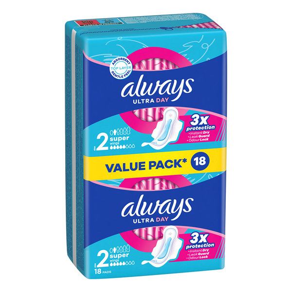 Οι Always Ultra Day Super Νο2 σερβιέτες, απορροφούν σε δευτερόλεπτα χάρη στην τεχνολογία InstantDry, και αποτρέπουν οσμές και διαρροές χάρη στις τεχνολογίες φράγμα LeakGuard και OdorLock.
