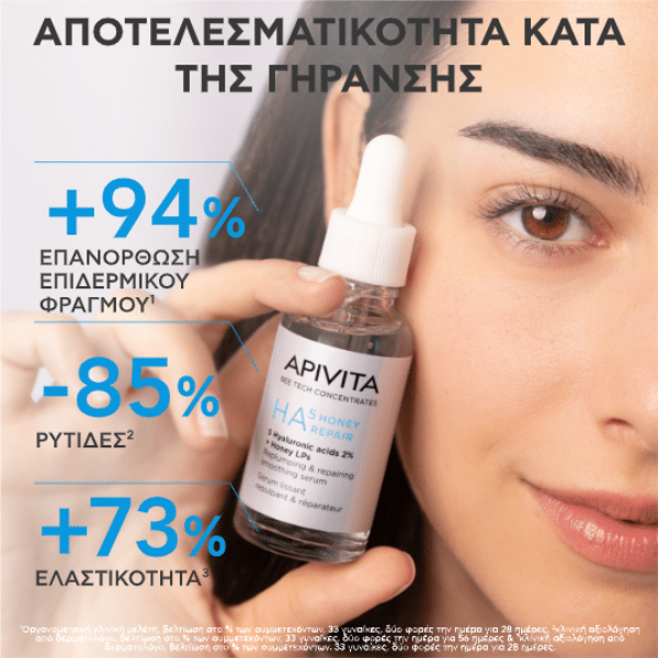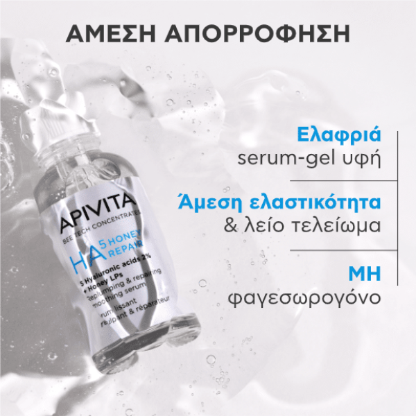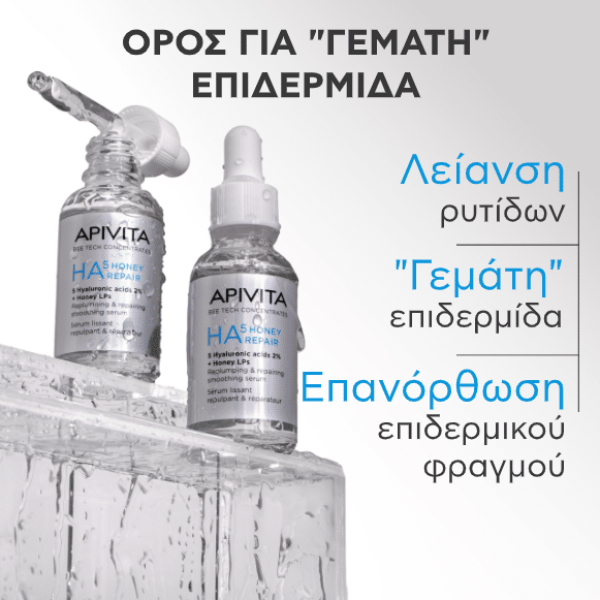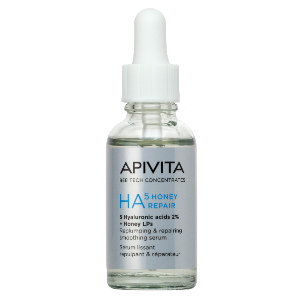 Ο ορός Bee Tech HA5 Honey Repair Serum από την Apivita, αξιοποιεί τον ισχυρό συνδυασμό για "γεμάτη" επιδερμίδα με Υαλουρονικό Οξύ και Μέλι που μειώνει ορατά τις ρυτίδες και χαρίζει σφριγηλότητα.