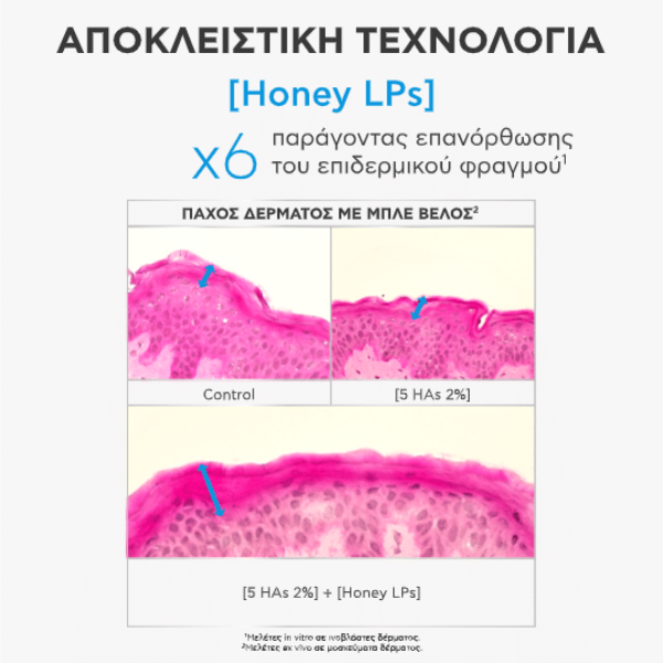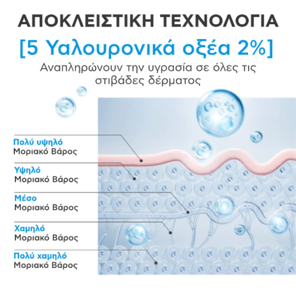Χάρη σε ένα ευρύ φάσμα 5 διαφορετικών μοριακών βαρών Υαλουρονικού Οξέος σε συγκέντρωση 2% αναπληρώνει την υγρασία όλων των στιβάδων του δέρματος. Είναι ενισχυμένος με την αποκλειστική τεχνολογία της Apivita, honey LPs, μια τεχνολογία ενθυλάκωσης των επουλωτικών συστατικών του μελιού για βαθιά εισχώρηση στην επιδερμίδα. Έχει αποδειχθεί ότι η τεχνολογία αυτή ενισχύει έως και 6 φορές την παραγωγή του παράγοντα επανόρθωσης του επιδερμικού φραγμού, ενισχύοντας έτσι την επιδερμική αναδόμηση και την διατήρηση της υγρασίας της επιδερμίδας.