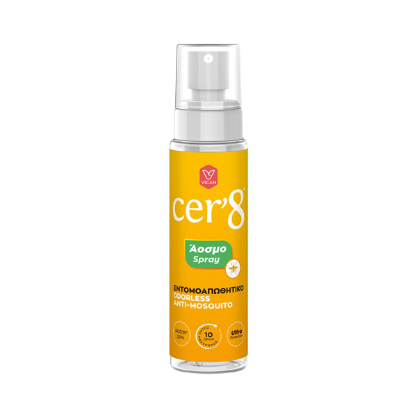 Το άοσμο εντομοαπωθητικό σπρέι από τη Cer'8, προστατεύει αποτελεσματικά από κουνούπια, συμπεριλαμβανομένου του «Ασιατικού κουνουπιού τίγρης» και σκνίπες.