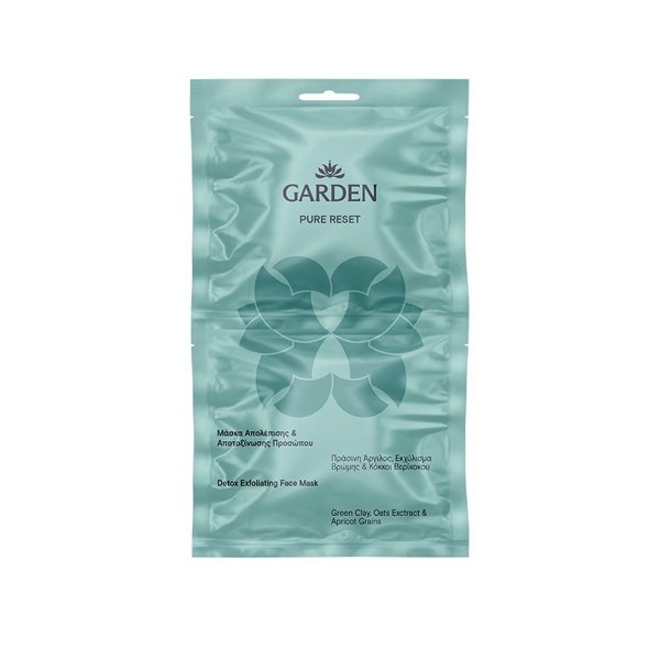 Η μάσκα απολέπισης και αποτοξίνωσης Garden Pure Reset με Πράσινο Άργιλο, Εκχύλισμα Βρώμης και Κόκκους Βερίκοκου απομακρύνει τα νεκρά κύτταρα απαλά, χωρίς να αφυδατώνει το δέρμα.