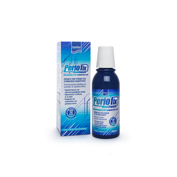 To Periofix 0.20% Mouthwash από την Intermed με τη δράση της χλωρεξιδίνης, είναι ιδανικό για την προστασία από την ουλοδοντική πλάκα και τη φροντίδα των ούλων.