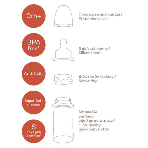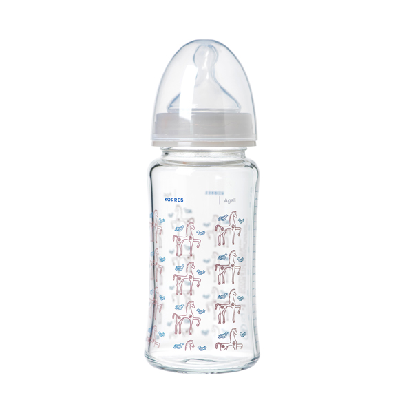 Γυάλινο μπιμπερό με θηλή σιλικόνης αργής ροής, κατάλληλο για βρέφη από 3 μηνών. Εργονομικός σχεδιασμός και πλατύς λαιμός για ευκολία στη χρήση και το καθάρισμα. Κατασκευασμένο από υψηλής ποιότητας Βοριοπυριτικό Γυαλί. Εξαιρετικά μαλακή θηλή σιλικόνης υψηλής ποιότητας:
