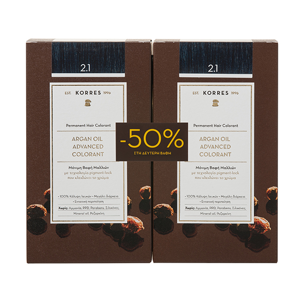 Korres Set Argan Oil Advanced Colorant Μόνιμη Βαφή Μαλλιών 2.1 Μαύρο Μπλέ 2τμχ -50% Στη 2η Βαφή