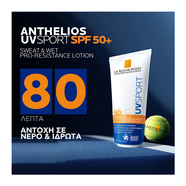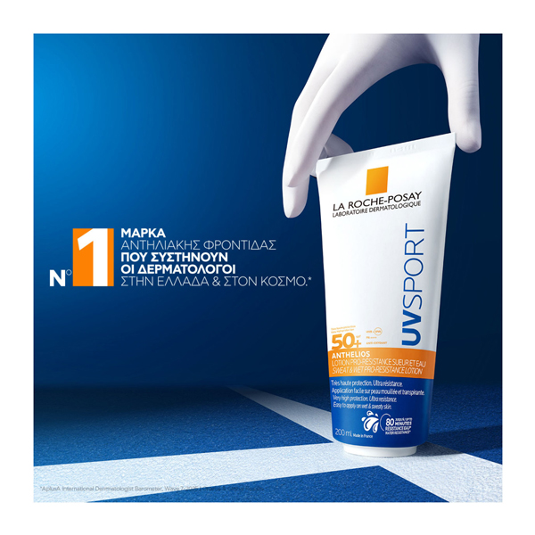 Το Anthelios UVSPORT Lotion της La Roche-Posay, σχεδιασμένο για δραστηριότητες υψηλής έντασης, δημιουργεί ένα υδρόφοβο φιλμ για πολύ υψηλή αντοχή στο νερό.