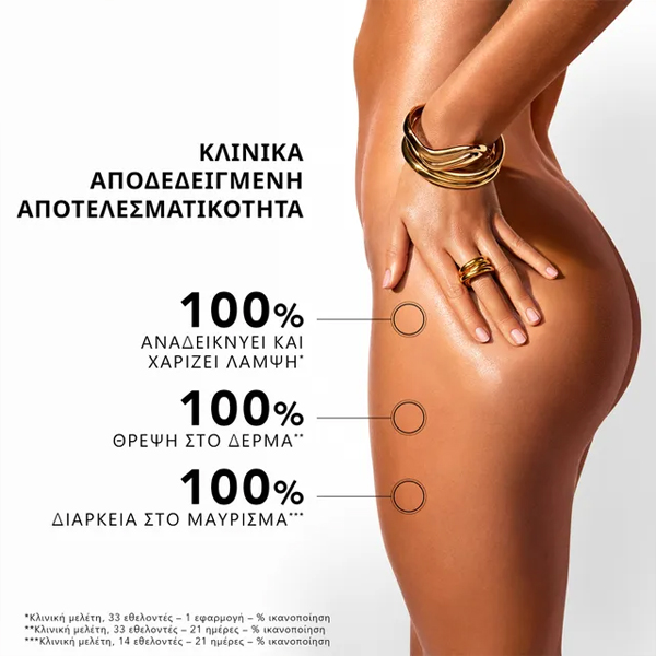 Εμπλουτισμένο με 4 πολύτιμα φυτικά έλαια: καμέλια, καμελίνα, jojoba και μακαντάμια, θρέφει, ενυδατώνει και διατηρεί τη λάμψη του μαυρίσματος μετά το καλοκαίρι. Εμπλουτισμένο με βοτανικό αντιοξειδωτικό σύμπλεγμα, βοηθά στην προστασία του δέρματος από τη φωτογήρανση.