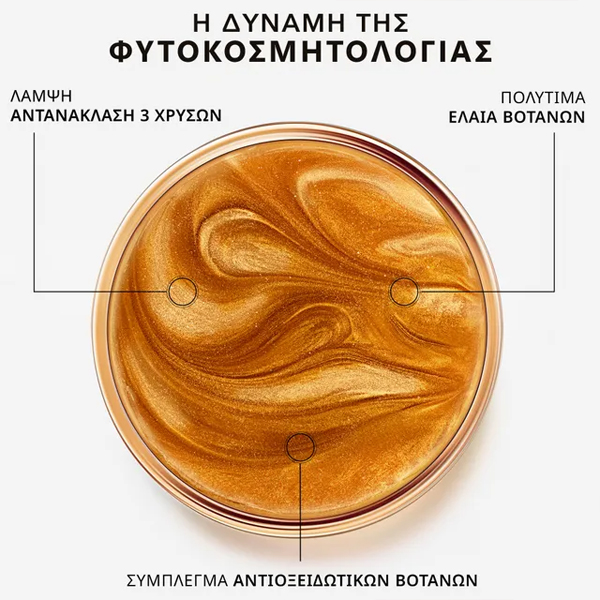 Αυτό το λάδι με ξηρή υφή αφήνει στο δέρμα ένα μεταξένιο πέπλο με ανταύγειες 3 χρυσών αποχρώσεων: το λευκό χρυσό φωτίζει και προσδίδει φρεσκάδα στη λάμψη, το κίτρινο χρυσό εντείνει το φως και προσφέρει ένα ακτινοβόλο ηλιακό αποτέλεσμα, το ροζ χρυσό ζεσταίνει την επιδερμίδα και προσθέτει μια αισθησιακή πινελιά. Αφήνει το δέρμα ιριδίζον, σατινέ, φωτεινό, και χρησιμοποιείται τόσο στο σώμα, στο πρόσωπο ως πινελιά λάμψης όσο και στα μαλλιά για να τονίσει τα μήκη τους.