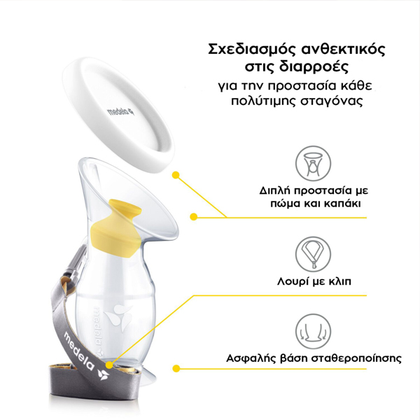 Με διπλή προστασία από διαρροές, λουρί και βάση σταθεροποίησης, που ασφαλίζει με κενό αέρος (βεντούζα), ο συλλέκτης μητρικού γάλακτος σιλικόνης της Medela προστατεύει κάθε πολύτιμη σταγόνα γάλακτος από το να χαθεί, για να διασφαλίσει ότι το μωρό σας θα το λάβει όλο.