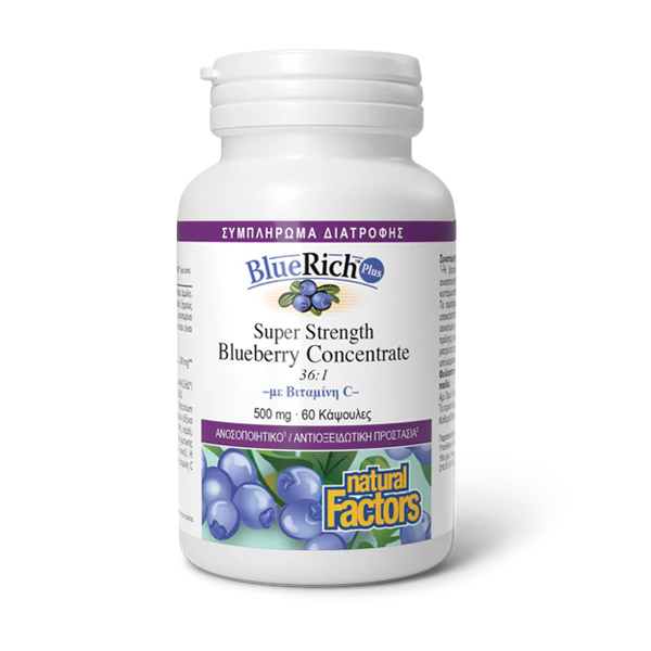 Το BlueRich Plus της Natural Factors είναι ένα υπερσυμπυκνωμένο εκχύλισμα αναλογίας 36:1, φτιαγμένο από ολόκληρα Blueberry καναδικής καλλιέργειας και παρέχει όλο το φάσμα των θρεπτικών συστατικών των Blueberry.