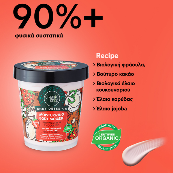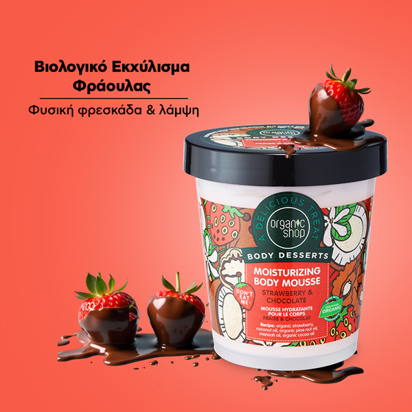Πληροφoρίες: Η ενυδατική μους σώματος Strawberry & Chocolate περιποιείται την επιδερμίδα σας παρέχοντάς της εξαιρετική απαλότητα και ανάλαφρη αίσθηση.