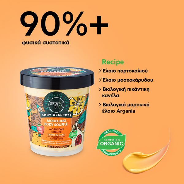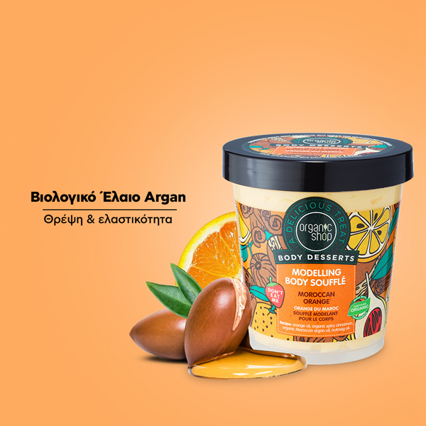 Πληροφoρίες: To σoυφλέ σμίλευσης με μαροκινό πορτοκάλι Moroccan Orange παρέχει απαλή περιποίηση στην επιδερμίδα σας επιτυγχάνοντας ένα όμορφο αποτέλεσμα σμίλευσης και προσδίδοντάς της ένα έντονο αναζωογονητικό άρωμα.