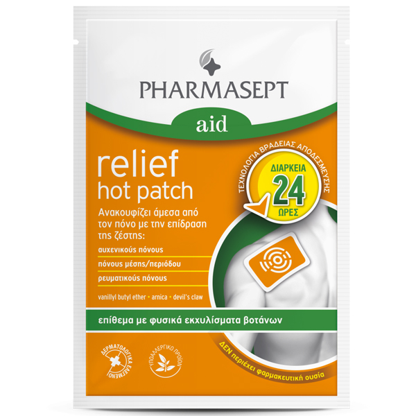 Το Pharmasept Relief Hot Patch με την εξειδικευμένη φόρμουλά του, εμπλουτισμένο με Vanillyl Butyl Ether, ένα φυσικό θερμαντικό παράγοντα χαμηλής ερεθιστικότητας, εκμεταλλεύεται τις ευεργετικές ιδιότητες των φυσικών εκχυλισμάτων του Αρπαγόφυτου, της Άρνικας και της Ιτιάς, για την επιδερμική ανακούφιση των περιοχών του σώματος που πάσχουν από πόνους των αρθρώσεων και των μυών, σπασμούς, ρευματικούς πόνους, πόνους μέσης, οσφυαλγίες, αυχενικούς πόνους, αθλητικούς τραυματισμούς και πόνους περιόδου, παρέχοντας μια ευχάριστη αίσθηση θερμότητας.