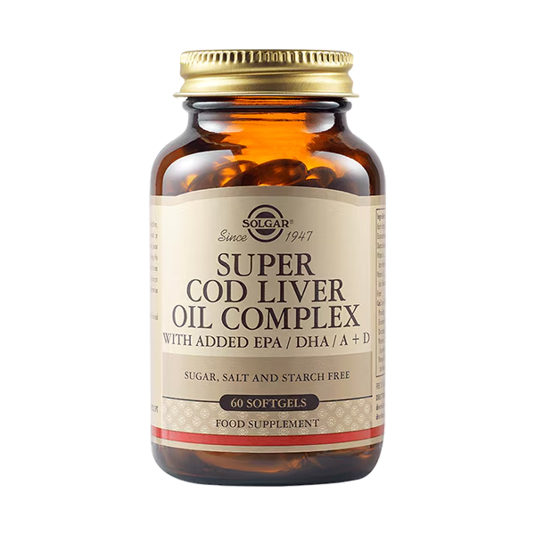 Το Solgar Super Cod Liver Oil Complex with Added EPA/DHA/A+D 60 Μαλακές Κάψουλες είναι μια φόρμουλα πλούσια σε βασικά λιπαρά οξέα και Βιταμίνες Α και D. To προϊόν προέρχεται από ψάρια βαθιάς, κρύας θάλασσας. Το συκώτι μουρούνας είναι πλούσια πηγή βασικών βιταμινών, όπως οι Βιταμίνες Α και D, και λιπαρών οξέων.