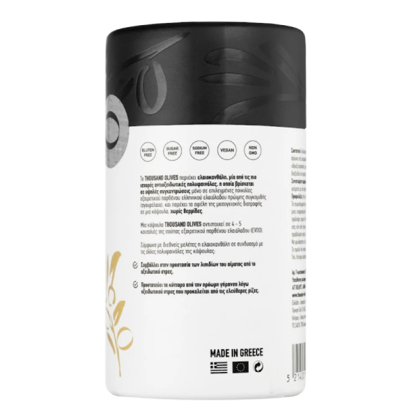 Κάθε συσκευασία Thousand Olives Oleocanthal Ελαιοκανθάλη περιέχει 30 κάψουλες, που προέρχονται από εκχύλισμα τουλάχιστον 1000 ελιών (thousand olives).