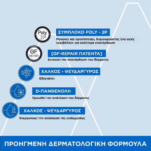 Ενεργά συστατικά Ιαματικό Νερό Uriage, Χαλκός, Ψευδάργυρος, Poly-2P Σμεκτίτης, GF-Repair, D-Πανθενόλη, Υαλουρονικό Οξύ, Οργανική Σιλικόνη.