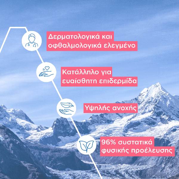 96% συστατικά φυσικής προέλευσης. Το μπουκάλι περιέχει 25% ανακυκλωμένο & 100% ανακυκλώσιμο πλαστικό.