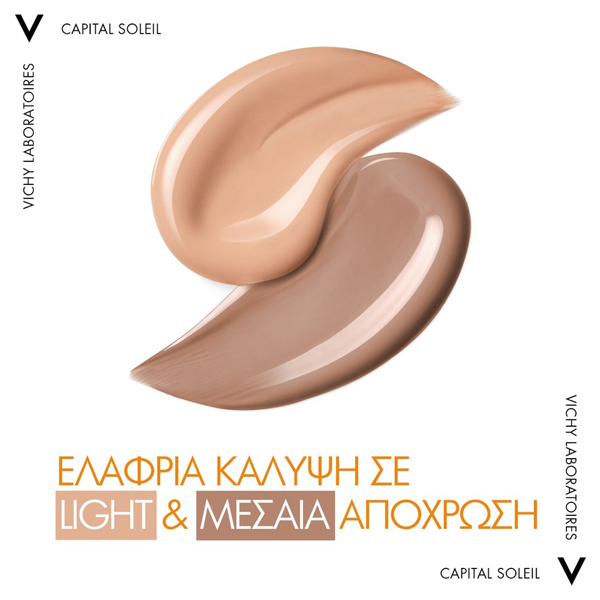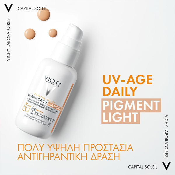 Η Vichy Capital Soleil UV-Age Daily Pigment προλαμβάνει τις ρυτίδες και τις κηλίδες που προκαλούνται από την UV ακτινοβολία και τη ρύπανση. Αποκλειστική Τεχνολογία NETLOCK, παρέχει πολύ υψηλή προστασία και ταυτόχρονα διορθώνει τα σημάδια φωτογήρανσης.