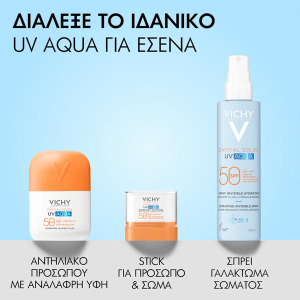 Το αόρατο αντηλιακό στικ Capital Soleil UV Aqua από τη Vichy, προσφέρει προηγμένη προστασία Spf50+, ενυδάτωση, ανάλαφρη και αόρατη αίσθηση, σαν το νερό.