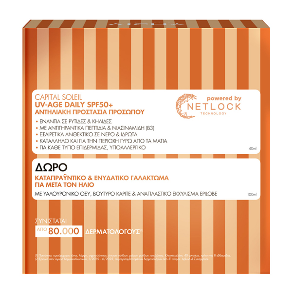 Η Vichy Capital Soleil UV-Age Daily προλαμβάνει τις ρυτίδες και τις κηλίδες που προκαλούνται από την UV ακτινοβολία και τη ρύπανση. Αποκλειστική Τεχνολογία NETLOCK: Συμπαγές και ομοιογενές λεπτό φίλμ, ανάλαφρο, αόρατο με μη λιπαρό τελείωμα.